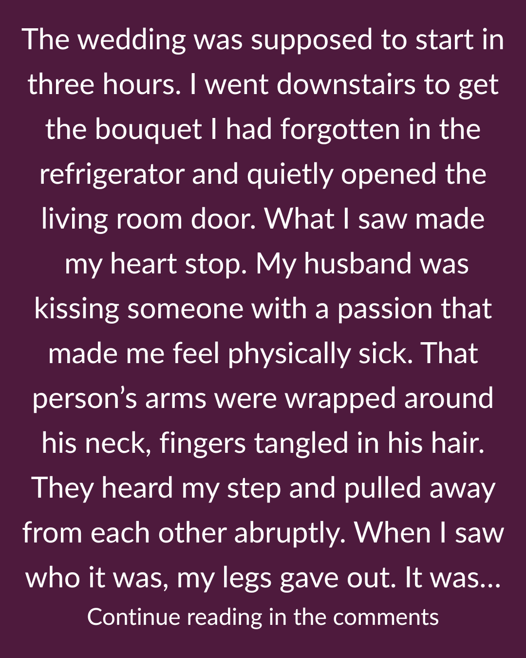 The wedding was supposed to start in three hours. I went downstairs to get the bouquet I had forgotten in the refrigerator and quietly opened the living room door. What I saw made my heart stop. My husband was kissing someone with a passion that made me feel physically sick. That person’s arms were wrapped around his neck, fingers tangled in his hair. They heard my step and pulled away from each other abruptly. When I saw who it was, my legs gave out. It was…