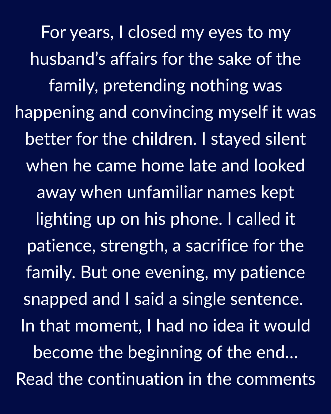 For years, I closed my eyes to my husband’s affairs for the sake of the family, pretending nothing was happening and convincing myself it was better for the children. I stayed silent when he came home late and looked away when unfamiliar names kept lighting up on his phone. I called it patience, strength, a sacrifice for the family. But one evening, my patience snapped and I said a single sentence. In that moment, I had no idea it would become the beginning of the end…