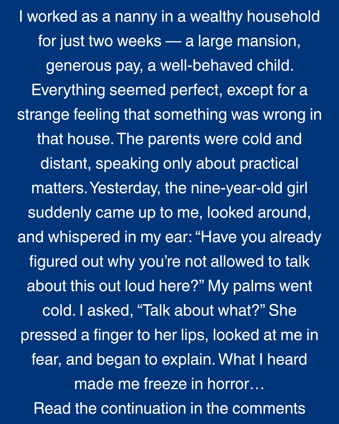 I worked as a nanny in a wealthy household for just two weeks — a large mansion, generous pay, a well-behaved child. Everything seemed perfect, except for a strange feeling that something was wrong in that house. The parents were cold and distant, speaking only about practical matters. Yesterday, the nine-year-old girl suddenly came up to me, looked around, and whispered in my ear: “Have you already figured out why you’re not allowed to talk about this out loud here?” My palms went cold. I asked, “Talk about what?” She pressed a finger to her lips, looked at me in fear, and began to explain. What I heard made me freeze in horror…
