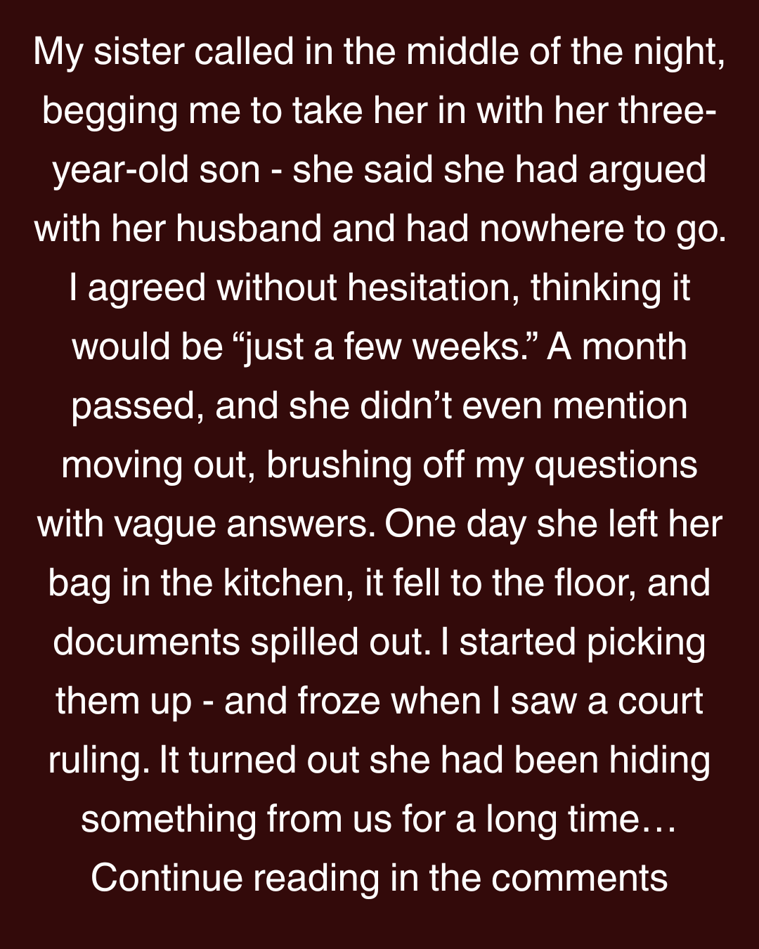 My sister called in the middle of the night, begging me to take her in with her three-year-old son — she said she had argued with her husband and had nowhere to go. I agreed without hesitation, thinking it would be “just a few weeks.” A month passed, and she didn’t even mention moving out, brushing off my questions with vague answers. One day she left her bag in the kitchen, it fell to the floor, and documents spilled out. I started picking them up — and froze when I saw a court ruling. It turned out she had been hiding something from us for a long time…