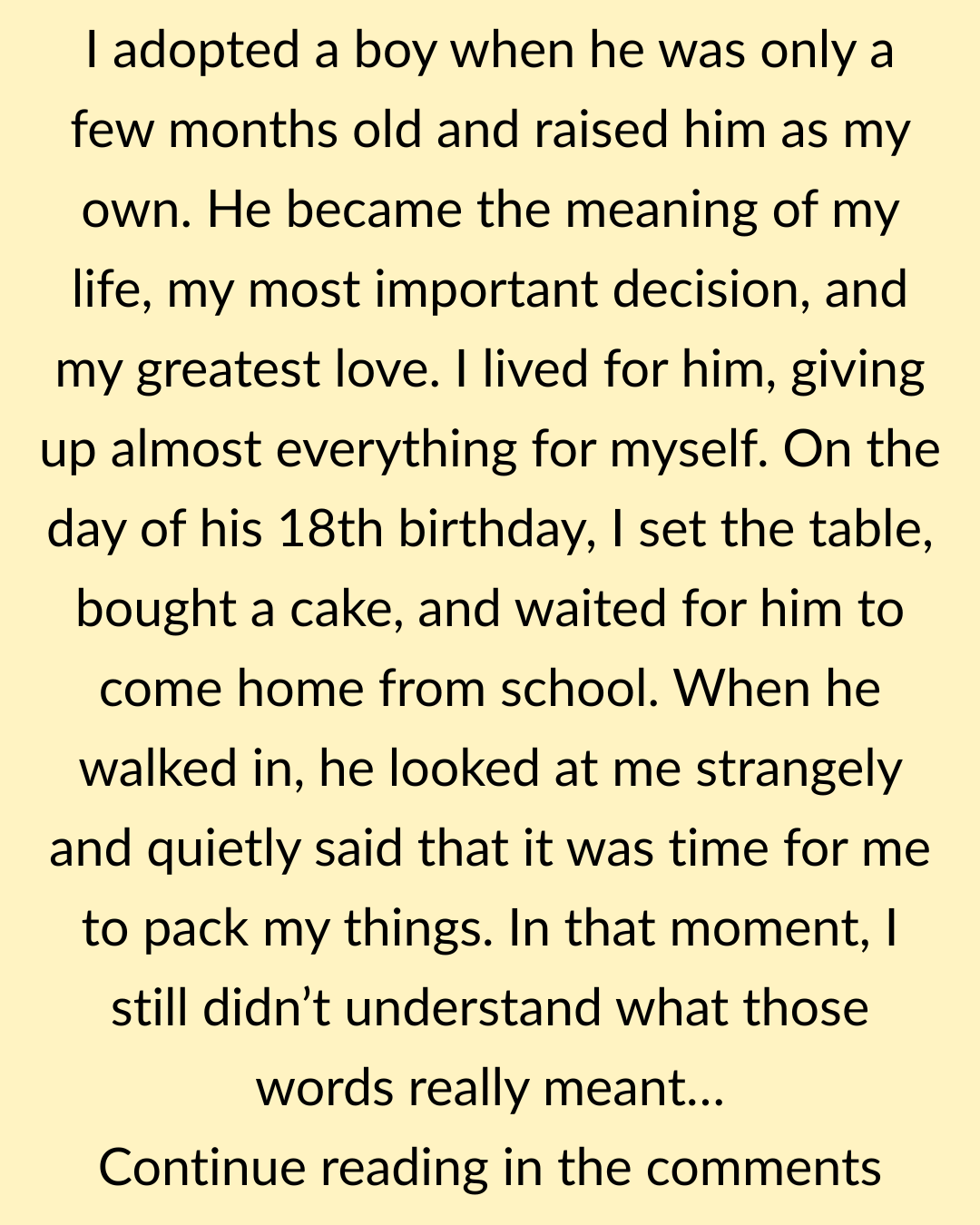 I adopted a boy when he was only a few months old and raised him as my own. He became the meaning of my life, my most important decision, and my greatest love. I lived for him, giving up almost everything for myself. On the day of his 18th birthday, I set the table, bought a cake, and waited for him to come home from school. When he walked in, he looked at me strangely and quietly said that it was time for me to pack my things. In that moment, I still didn’t understand what those words really meant…