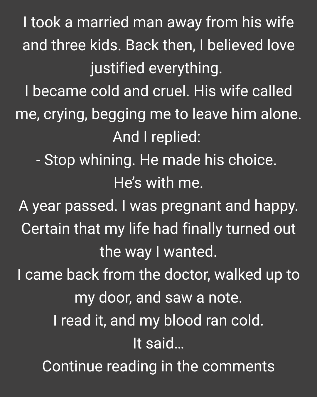 I sat down on the floor in the hallway, clutching the note to my stomach, unable to breathe. It was like a punch to the chest. Did I destroy someone else’s family for this? Did I take a father from three children for a man who left me pregnant a year later?