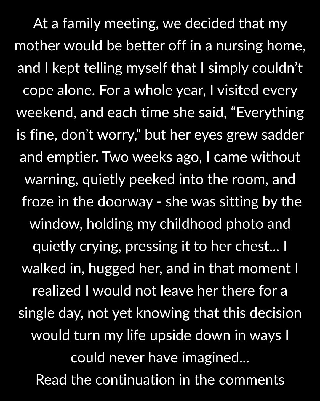 At a family meeting, we decided that my mother would be better off in a nursing home, and I kept telling myself that I simply couldn’t cope alone. For a whole year, I visited every weekend, and each time she said, “Everything is fine, don’t worry,” but her eyes grew sadder and emptier. Two weeks ago, I came without warning, quietly peeked into the room, and froze in the doorway – she was sitting by the window, holding my childhood photo and quietly crying, pressing it to her chest… I walked in, hugged her, and in that moment I realized I would not leave her there for a single day, not yet knowing that this decision would turn my life upside down in ways I could never have imagined…