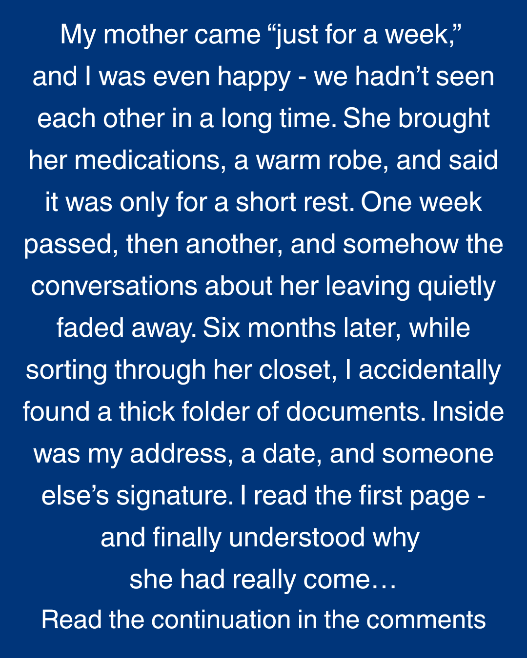 My mom came “for a week,” and I was even happy about it — we hadn’t seen each other for a long time. She brought her medicines, a warm robe, and said she’d be here shortly, just to relax. A week passed, then the second, and talks about returning just faded away. Six months later, while sorting through her closet, I accidentally stumbled upon a thick folder with documents. Inside was my address, a date, and an unknown signature. And at that moment, I understood that I had been living in someone else’s preplanned scenario all this time…