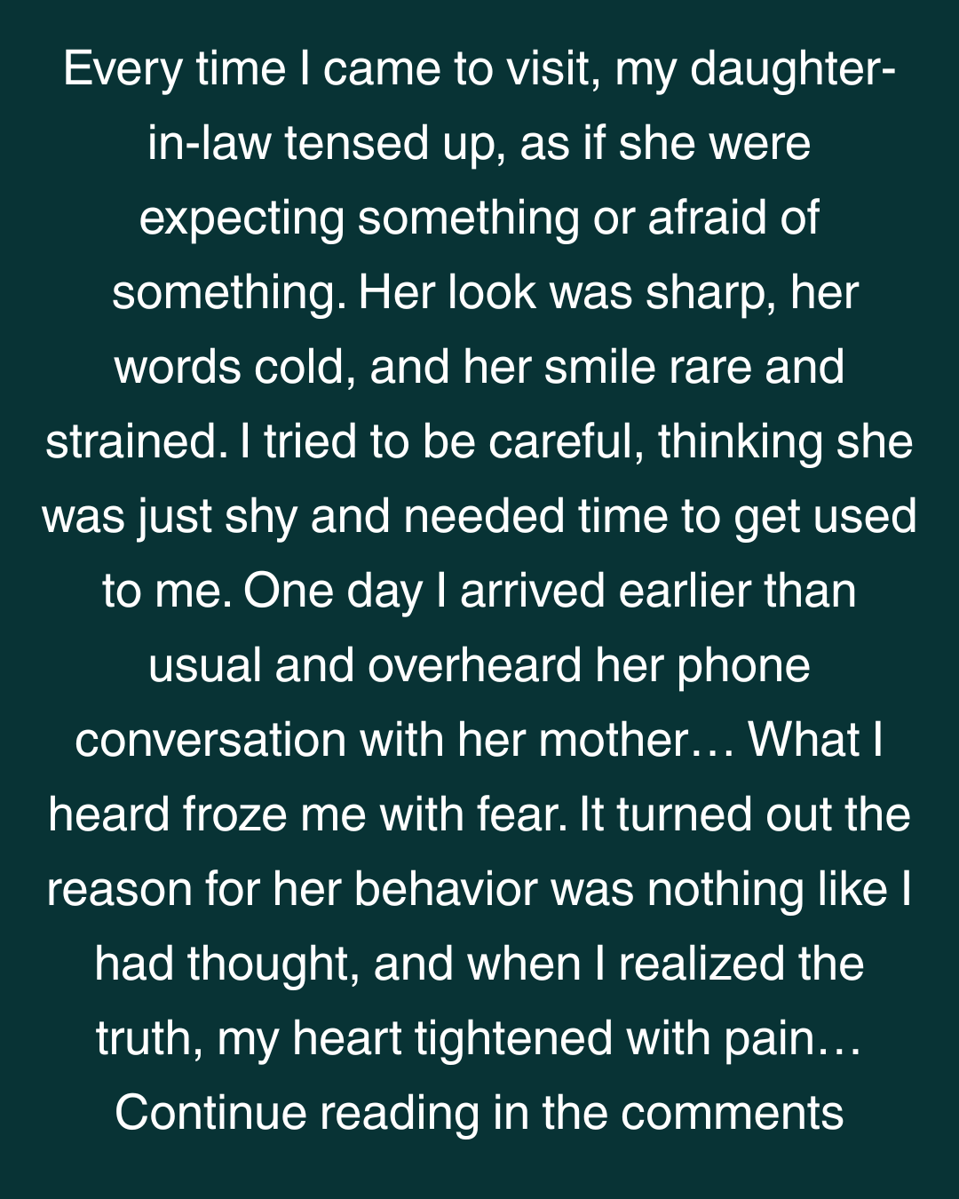 Every time I came to visit, my daughter-in-law tensed up, as if she were expecting something or afraid of something. Her look was sharp, her words cold, and her smile rare and strained. I tried to be careful, thinking she was just shy and needed time to get used to me. One day I arrived earlier than usual and overheard her phone conversation with her mother… What I heard froze me with fear. It turned out the reason for her behavior was nothing like I had thought, and when I realized the truth, my heart tightened with pain…