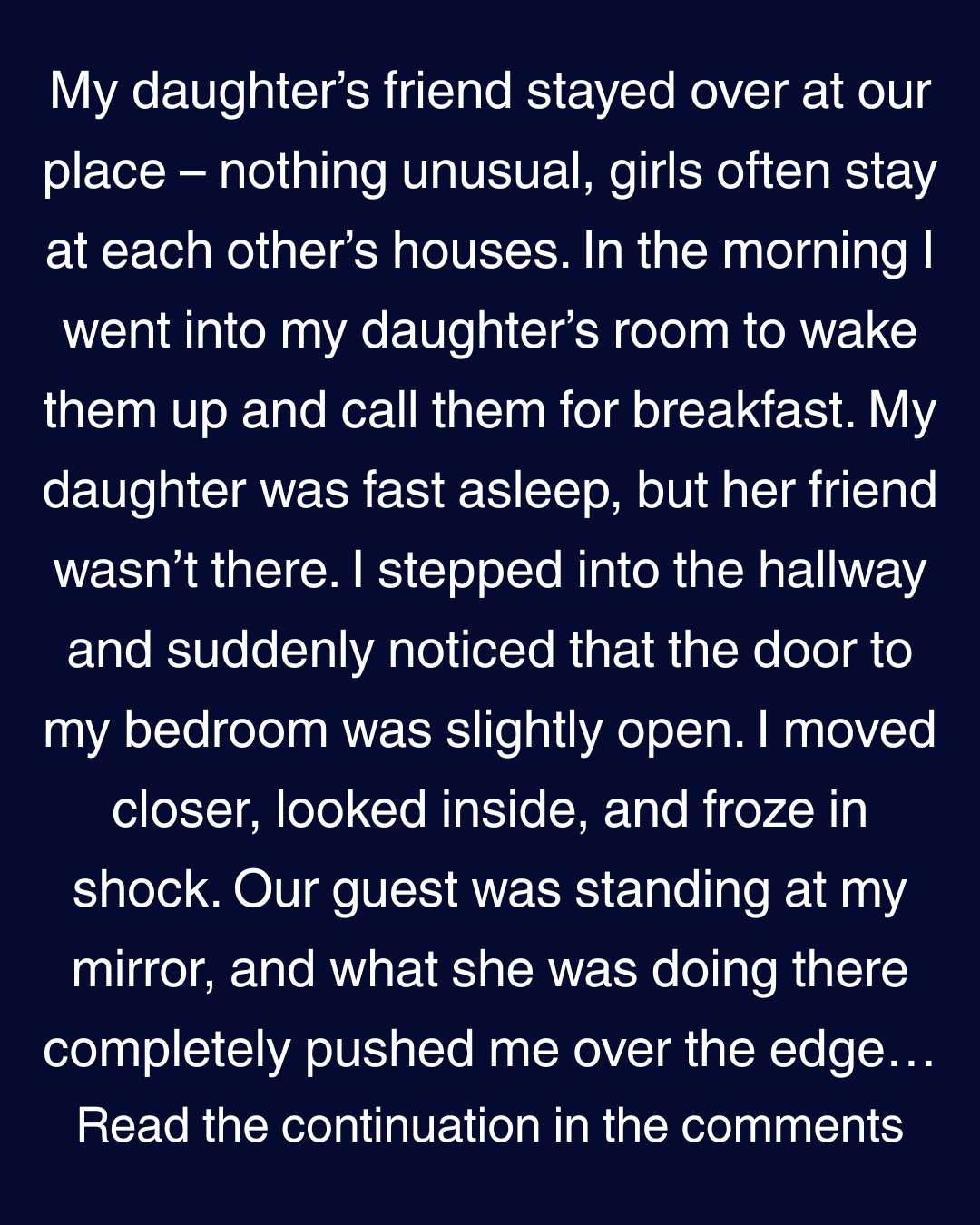 My daughter’s friend stayed over at our place – nothing unusual, girls often stay at each other’s houses. In the morning I went into my daughter’s room to wake them up and call them for breakfast. My daughter was fast asleep, but her friend wasn’t there. I stepped into the hallway and suddenly noticed that the door to my bedroom was slightly open. I moved closer, looked inside, and froze in shock. Our guest was standing at my mirror, and what she was doing there completely pushed me over the edge…