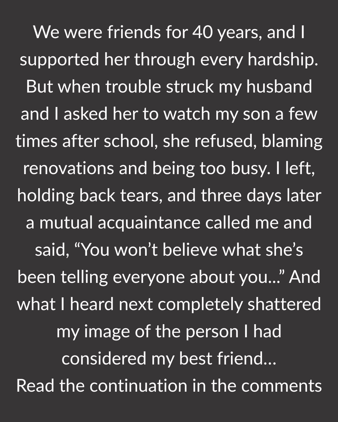 We had been friends for 40 years, and I supported her through every hardship. Yet when a crisis struck with my husband and I asked her to watch my son a few times after school, she refused, citing renovations and being too busy. I left, holding back tears, and three days later, our mutual acquaintance called me and said: “You won’t believe what she’s telling everyone about you…” What I heard next completely shattered my impression of the person I thought was my best friend…