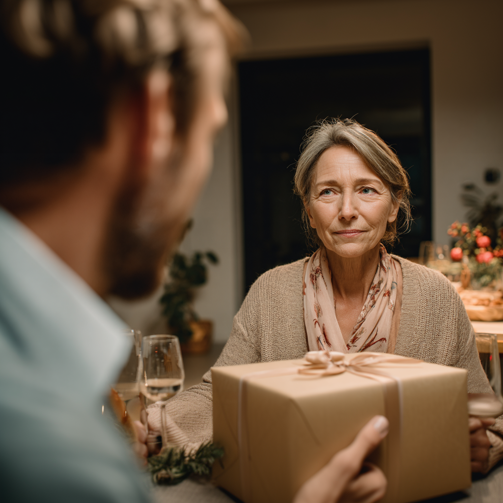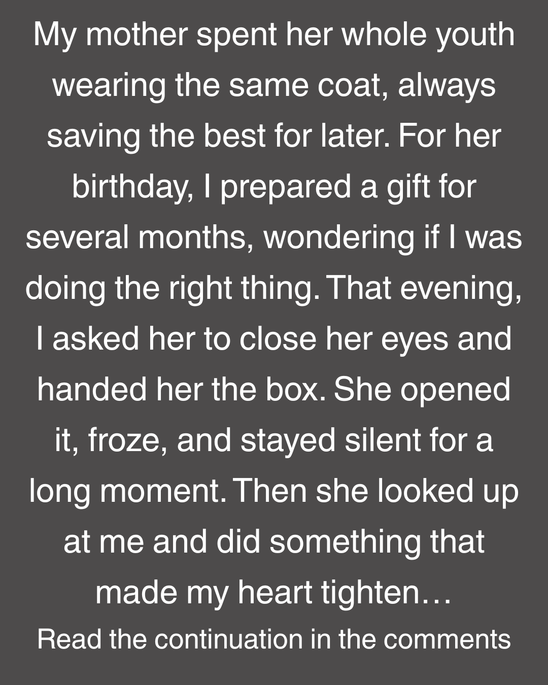 My mother spent her whole youth wearing the same coat, always saving the best for later. For her birthday, I prepared a gift for several months, wondering if I was doing the right thing. That evening, I asked her to close her eyes and handed her the box. She opened it, froze, and stayed silent for a long moment. Then she looked up at me and did something that made my heart tighten…