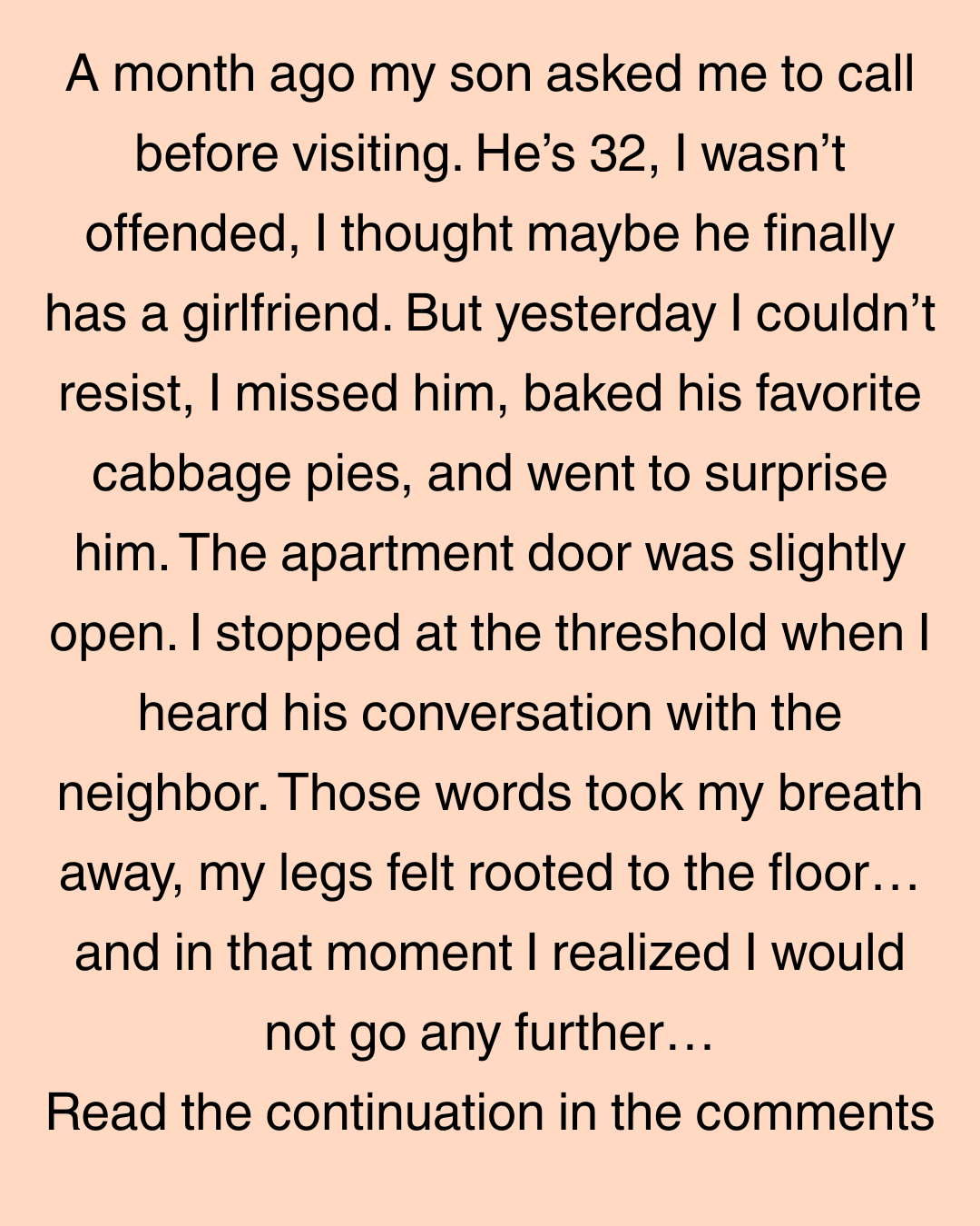 A month ago my son asked me to call before visiting. He’s 32, I wasn’t offended, I thought maybe he finally has a girlfriend. But yesterday I couldn’t resist, I missed him, baked his favorite cabbage pies, and went to surprise him. The apartment door was slightly open. I stopped at the threshold when I heard his conversation with the neighbor. Those words took my breath away, my legs felt rooted to the floor… and in that moment I realized I would not go any further…