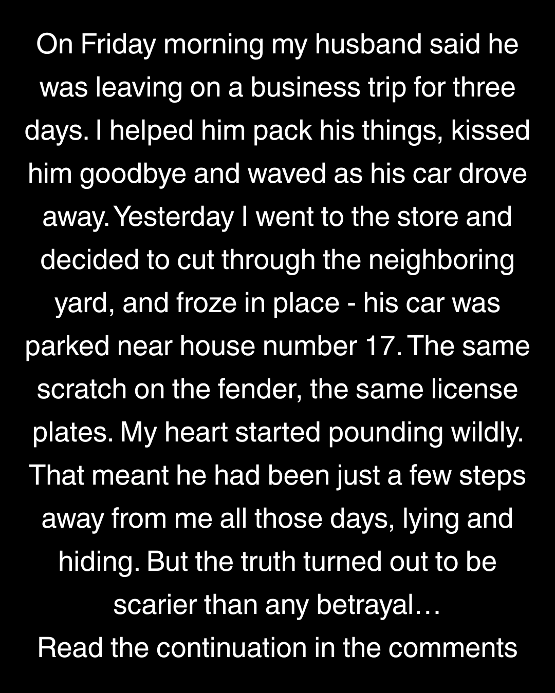On Friday morning my husband said he was leaving on a business trip for three days. I helped him pack his things, kissed him goodbye and waved as his car drove away. Yesterday I went to the store and decided to cut through the neighboring yard, and froze in place – his car was parked near house number 17. The same scratch on the fender, the same license plates. My heart started pounding wildly. That meant he had been just a few steps away from me all those days, lying and hiding. But the truth turned out to be scarier than any betrayal…