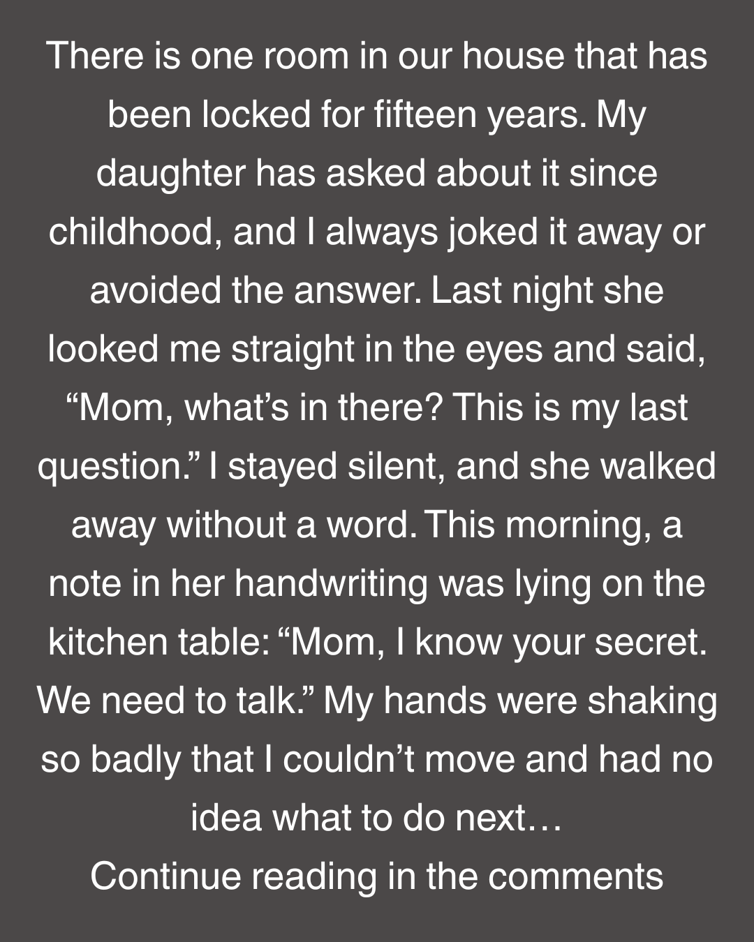 There is one room in our house that has been locked for fifteen years. My daughter has asked about it since childhood, and I always joked it away or avoided the answer. Last night she looked me straight in the eyes and said, “Mom, what’s in there? This is my last question.” I stayed silent, and she walked away without a word. This morning, a note in her handwriting was lying on the kitchen table: “Mom, I know your secret. We need to talk.” My hands were shaking so badly that I couldn’t move and had no idea what to do next…