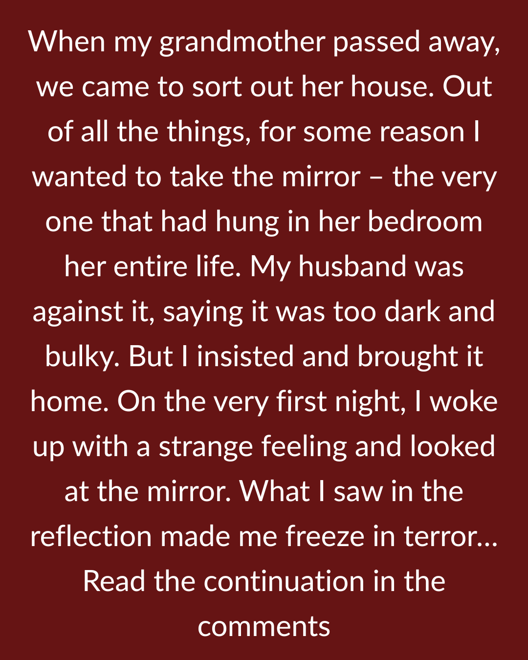 It hung in her bedroom for as long as I can remember. Large, in a heavy wooden frame, darkened by time. Every day, my grandmother used to wipe it with a soft cloth, as if it weren’t an object but something alive that needed care. As a child, I asked her why she fussed over it so much. She looked at me strangely and said, “The mirror remembers. It remembers everything.”